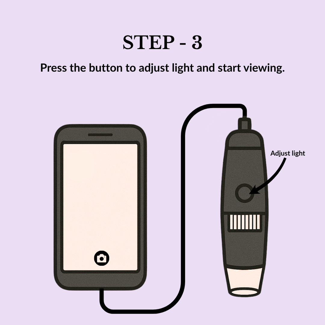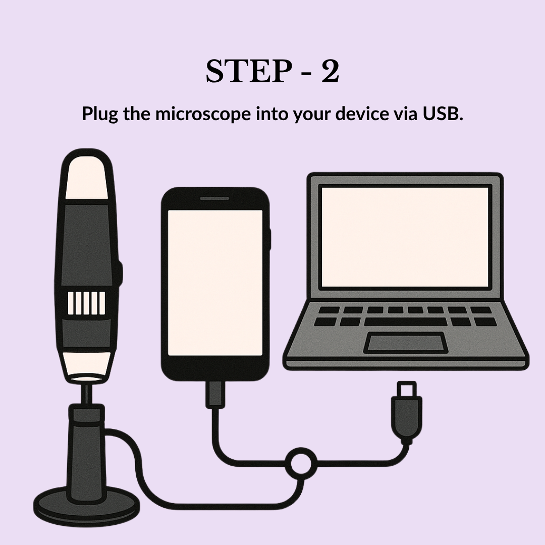 AuraLens is a plug-and-play microscope that connects to your Android phone or Windows laptop using a simple USB cable. Just install our free app, plug in the device, and start scanning your skin in real time—no batteries or complex setup needed.